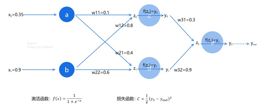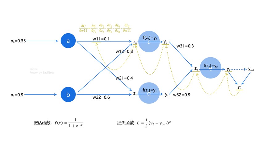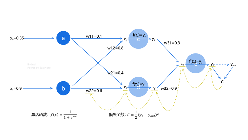 为了更加方便大家理解,这里先给各个权重添加随机的初始值。初始值很多时候真的是随机给的,依靠的是训练过程中不断算法修改参数,从而训练出一个可用的神经网络。咱现在这个神经网络只是期望训练出当拿到 x0=0.35 x1=0.9 的输入时,能够返回 $y_{out}=0.5$ 的输出。标记了添加了随机权重初始值的示意图如下