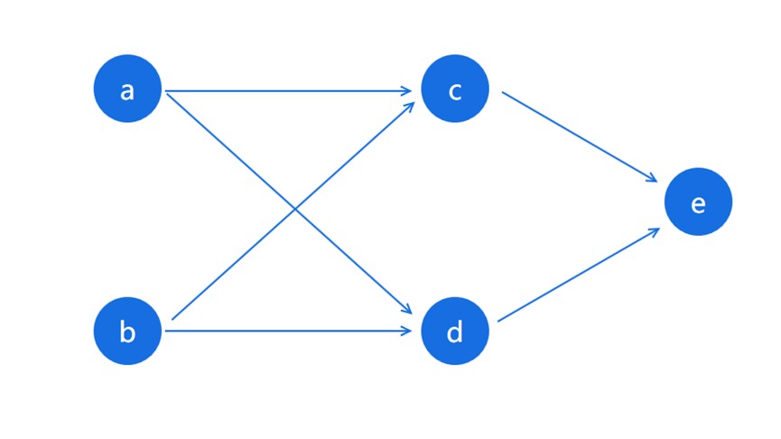 其中 a 和 b 两个点负责输入,e点负责输出。各个点之间的连接存在权重,其示意图如下,下图的 wxx 表示的就是各个边的权重。写成 wxx 的形式其实就是在隐含矩阵的概念了,只是咱本文这里不需要请出矩阵而已,如果真套上矩阵的话,这里的权重就是 w行列的表示法,即 w21 就是表示第2行第1列的值。这也是一个习惯表示方法