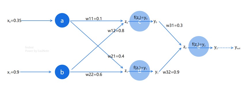 假定有输入源 x0=0.35 x1=0.9 , 期望的输出是 $y_{out}=0.5$。这就是一组训练值,当然了,在实际的神经网络训练里面,肯定会给许多组训练值的。只是现在换成人类手算,需要降低难度,就只要求训练这一组数据。假定没有神经网络,就是一个正常人类在拿到 x0=0.35 x1=0.9的输入,要求写出一个函数,让这个函数能够根据此输入计算出 $y_{out}=0.5$ 的值,估计也没那么简单(禁止直接写 $f(x0,x1)=0.5$ 这样的拖出去打靶的函数)