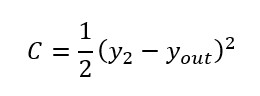 损失函数要能反馈结果和预期的距离,且还要能够求导有意义。一听到反馈结果和预期的距离,大家可能想到的就是直接减就可以了,如这样的一个函数$C=y_2-y_{out}$,但在后续步骤里一求导就约分没了,算出来的$C^{’}=1$,自然就无法继续进行下去了。那求差的平方呢,如$C=(y_2-y_{out})^2$呢?这个就好多了,加上平方也不用去烦恼绝对值的问题了,那自然就求结果和预期的差的平方好了。试试看求导的结果 $C^{’}=2y_2-2y_{out}$,这一求导发现约分出了2的值,那索性继续乘以二分之一好了,这样求导返回结果刚好就是简单的减法,计算机看了非常开森。于是决定出来的损失函数定义如下