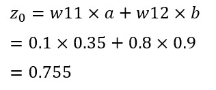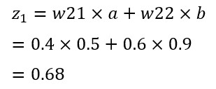 var z0 = w11 * a + w12 * b;这个过程看起来十分简单,就是将所有进入 c 点的输入乘以对应的权重返回的和。同理继续计算d点的$z_1$的值