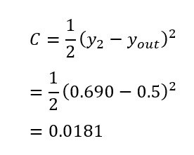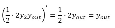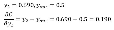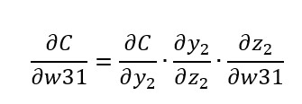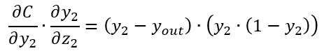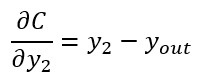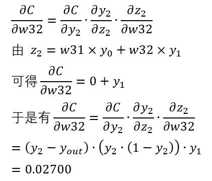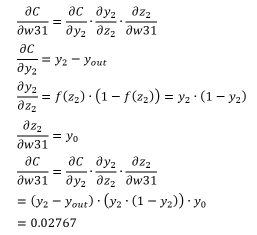 var dc_dw31 = (y2 - y_out) * (y2 * (1 - y2)) * y0; var dc_dw32 = (y2 - y_out) * (y2 * (1 - y2)) * y1;
