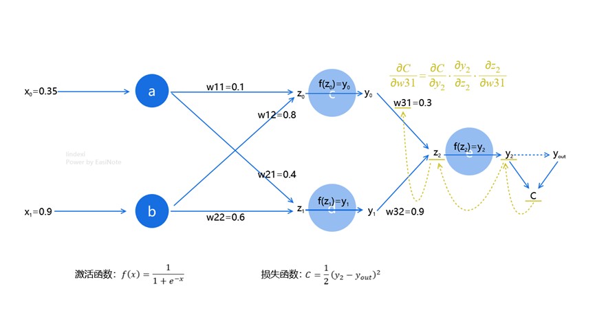 如求w31的偏导,就可以从y2到z2再到w31这样一步步求偏导做乘法,如以下示意图所示