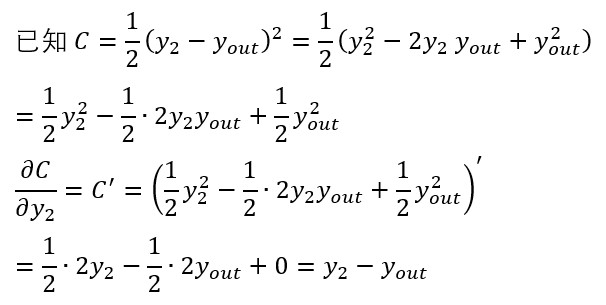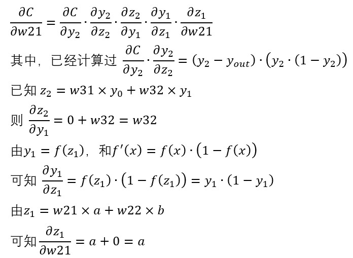 var dc_dw21 = (y2 - y_out) * (y2 * (1 - y2)) * w32 * (y1 * (1 - y1)) * a;按照以上求偏导方式,可得