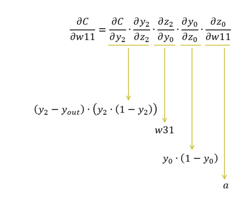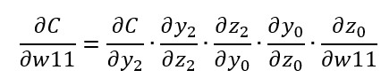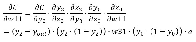 var dc_dw11 = (y2 - y_out) * (y2 * (1 - y2)) * w31 * (y0 * (1 - y0)) * a; var dc_dw12 = (y2 - y_out) * (y2 * (1 - y2)) * w31 * (y0 * (1 - y0)) * b;