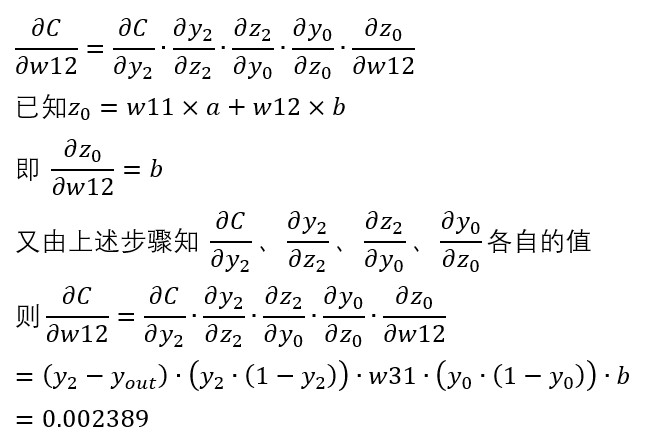 var dc_dw12 = (y2 - y_out) * (y2 * (1 - y2)) * w31 * (y0 * (1 - y0)) * b;同理也可以继续求w21的偏导