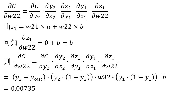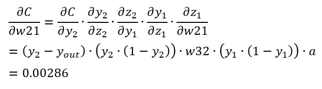 var dc_dw21 = (y2 - y_out) * (y2 * (1 - y2)) * w32 * (y1 * (1 - y1)) * a; var dc_dw22 = (y2 - y_out) * (y2 * (1 - y2)) * w32 * (y1 * (1 - y1)) * b;